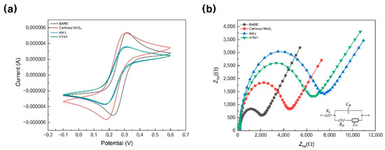 As can be seen from the CV results, the current value is increased by immobilizing carboxyl-MoS2 (Figure 4a. Red line). This phenomenon would be elucidated by carboxyl-MoS2 has a current amplification effect [27]. In addition, introducing the silver ions in 4WJ, electrochemical signal was embodied [25]. The reason why the current range is lower than carboxyl-MoS2 on Au substrate is due to the correlation between Au/carboxyl-MoS2 and 4WJ. If only 4WJ was inserted without introducing silver ions, it would have formed a smaller current range than Figure 4a. As a result, by adding carboxyl-MoS2 and 4WJ, the EIS tendency as shown in Figure 4b was formed, and the EIS result of Au/carboxyl-MoS2/4WJ/H1N1 was able to detect H1N1 up to a wider range of concentrations.
