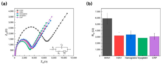 (a) Impedance spectra of proposed biosensor with various targets (100 nM), including H1N1 (black line), H5N1 (red line), hemoglobin (blue line), myoglobin (green line), and CRP (purple line) in 5 mM [Fe(CN)6]3−/4− solution in 10 mM HEPES (pH 7.04) containing 1 M KCl. (b) Change in charge-transfer resistance based on selectivity test (error bars: standard deviation). CRP, C-reactive protein; HEPES, 4-(2-hydroxyethyl)-1-piperazineethanesulfonic acid.
