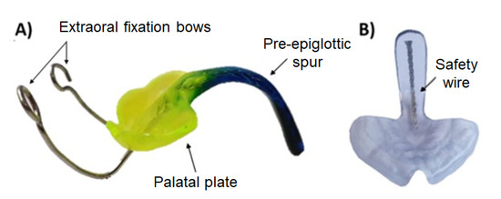 Robin sequence (RS) is considered a rare disease with an incidence of 1/8060 births in Germany [1,2]. Nonetheless, it needs to be treated right from birth. It is characterized by mandibular retrognathia, micrognathia and glossoptosis, as well as upper airway obstruction (Figure 1). Furthermore, RS is accompanied by a cleft palate in 80–90% of cases [3]. For this condition, the Tübingen palatal plate (TPP) is the treatment of choice at the University Hospital Tübingen [3,4,5,6,7,8]. This orthodontic appliance is shown in Figure 2. It consists of a palatal base plate covering the hard palate and cleft as well as the alveolar ridges, in order to support a velar extension or spur of individual length (approximately 3 cm; Figure 2), which is dorsally attached to the palatal plate and ends just above the epiglottis [3]. The TPP is able to relieve the upper airway obstruction by pushing the base of the tongue forward, thereby widening the pharynx [4]. The placement of the TPP is shown in Figure 1.