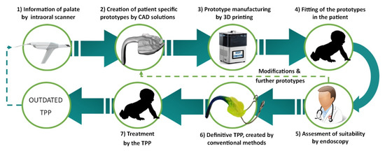 The above process is still time-consuming and prone to human error. The device occasionally shows some warping when transferring the prototype to the definitive TPP. Other studies have shown that acrylic resins are prone to shrinkage due to the polymerization process [10,11]. In addition, feedback from clinicians indicated that shrinkage might result in a worse fit of the TPP on the palate. In a previous study, it was pointed out that this issue could be avoided by having a complete digital workflow and manufacturing the final TPP by computer-aided design (CAD) and computer-aidedmanufacturing (CAM) technologies [5].
