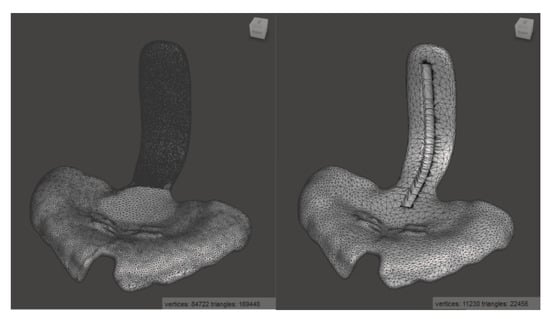 As the TPP STL file from the digital workflow contains too many triangles to be processed in Solidworks 2019 (Dassault Systemes SE, Vélizy-Villacoublay, France), the number was reduced from about 170,000 to 22,000 by using Meshmixer (Autodesk Inc., San Rafael, CA, USA) while avoiding to loose detail and with only a minimal reduction in accuracy (Figure 4). To preserve more detail in the area of the patient’s palate, a higher mesh reduction rate was used for the spur.