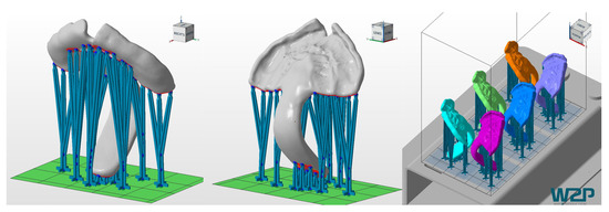 It is important to underline that for this study, a clinically relevant build orientation was employed in all technologies. Samples were positioned so that no support structures were placed in the palatal area, where a higher degree of accuracy is needed. Instead, it was considered preferable to position them in areas that will be post-processed later on (Figure 5 and Figure 6). This build orientation is known to significantly influence the process and fabrication attributes, such as manufacturing time, part cost and surface finish [15]. Therefore, the obtained values are largely dependent on the used build orientation.