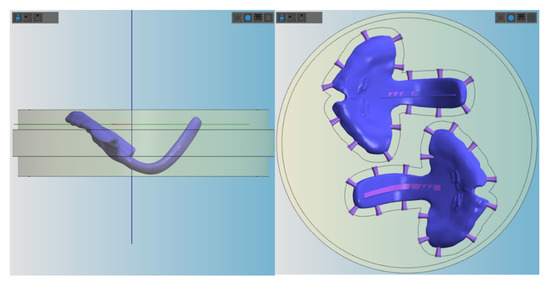 All AM materials were printed in 100 µm, except for Freeprint tray, which could only be manufactured at a minimum layer height of 200 µm. AM samples (n = 6) were printed vertically, placing support structures, as shown in Figure 5. In contrast, SM samples were placed horizontally in order to fit in the defined blank thickness and connectors were situated as displayed in Figure 6.