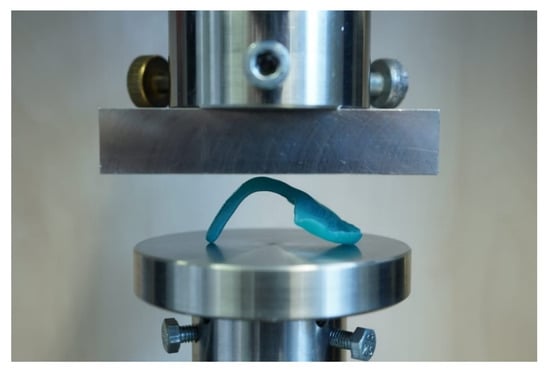 For testing, the TPP samples with and without wire were positioned flat with two contact points at the front part of the palate and one contact point at the apical end of the spur. Hereby, the force of the load plate was applied in the curvature of the orthodontic appliance (Figure 8). All tests were performed in a universal testing machine (Zwick Z010, Zwick GmbH, Ulm, Germany) with the following measuring parameters [12]: 10,000 N load cell, crosshead speed of 2 mm/min and a preload force of 1 N. The maximum deflection of 14 mm was set in the machine.