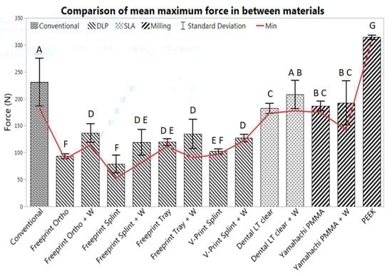 Mean max force (n = 6) and standard deviation, obtained from the TPPs manufactured by all evaluated materials with (+ W) and without wire. The conventional solution (Orthocryl + W) was compared to AM materials (middle group) and SM materials (right group). The letters denote the results of the paired Student’s t-test with a p-value of <0.05.