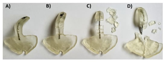 Different breaking patterns were observed in TPPs with wire from the ideal case (left) to the worst scenario (right) in Dental LT clear SLA material. (A) Ideal case, no cracks after application of the force; (B) sample broke, all pieces attached to the wire; (C) sample broke, the biggest parts still attached to the wire, smaller ones detached from the wire; (D) worst scenario, where the sample broke and the safety wire, as well as all pieces, are completely detached from the palatal plate and go further in the pharynx of the patient.