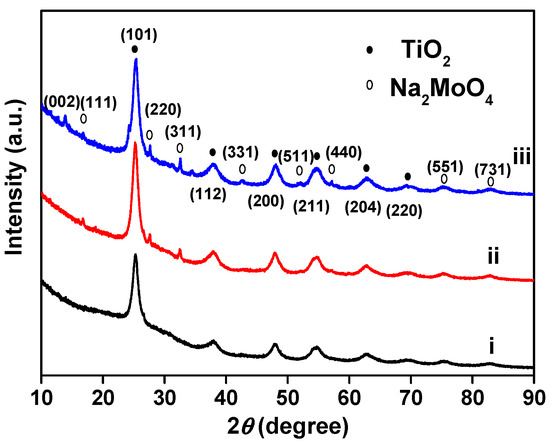 XRD patterns of the nanotubular Na2MoO4/TiO2 composites of (i) Na2MoO4–15.4%-TiO2, (ii) Na2MoO4–24.1%-TiO2, (iii) Na2MoO4–41.4%-TiO2.