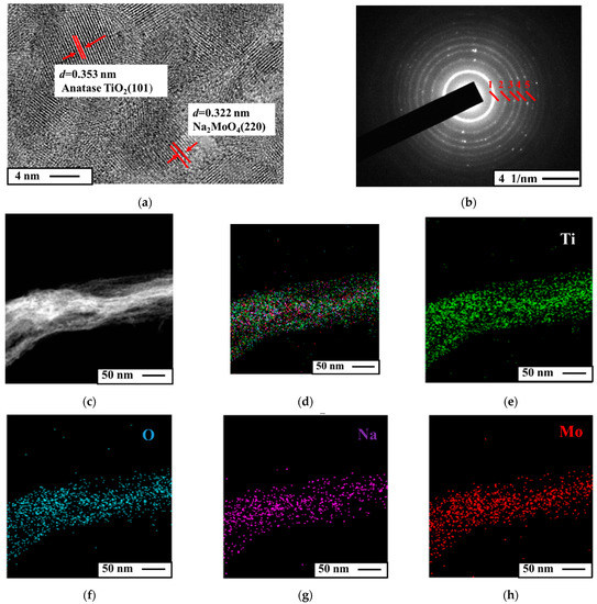 Figure 4a shows a HR-TEM image of the composite nanotube surface of the Na2MoO4–41.4%-TiO2 sample, and two types of lattice spacing of 0.353 and 0.322 nm are detected, which correspond to the (101) crystal plane of the anatase phase TiO2 and the (220) crystal plane of the α-Na2MoO4 phase, respectively. The diffraction rings labelled by Nos. 1–5 from the inside to the outside in the SAED pattern of the Na2MoO4–41.4%-TiO2 nanocomposite (Figure 4b) correspond to the (101), (004), (200), (211), and (213) reflections of the anatase phase TiO2, accordingly; suggesting the conversion of the amorphous titania into anatase nanocrystals during the calcination process [58]. These consequences are in good agreement with the XRD results. The elemental distribution of a single Na2MoO4–41.4%-TiO2 nanocomposite tube is shown in the EDS mapping micrographs (Figure 4c–h), which demonstrate the existence of Na, Mo, O, and Ti elements in this nanocomposite. Moreover, the signals of Ti element are mainly focused on the middle area of the nanotube, while those of the Na and Mo elements are mostly distributed in the outer edges. It further proves that the Na2MoO4 particles are evenly loaded on the outside of the TiO2 nanotubes and the Na2MoO4–41.4%-TiO2 composite duplicates the interwoven network structure of the primitive cellulose substance.