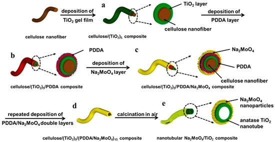 Schematic illustration of the synthetic processes for the nanotubular Na2MoO4/TiO2 composite derived from natural cellulose substance. (a) The titania–cellulose-nanofiber composite was prepared by the surface sol-gel process. (b) The PDDA/titania/cellulose-nanofiber composite was obtained by depositing the PDDA layer onto the titania–cellulose-nanofiber composite surface. (c) The Na2MoO4/PDDA/titania/cellulose-nanofiber composite was prepared by depositing the Na2MoO4 layer onto the PDDA/titania/cellulose-nanofiber composite surface. (d) The (PDDA/Na2MoO4)15/titania/cellulose composite was prepared by repeating the deposition of the PDDA/Na2MoO4 double layer 15 times. (e) The nanotubular Na2MoO4/TiO2 composite was obtained by the calcination of the as-deposited (PDDA/Na2MoO4)15/titania/cellulose composite sheet in air.