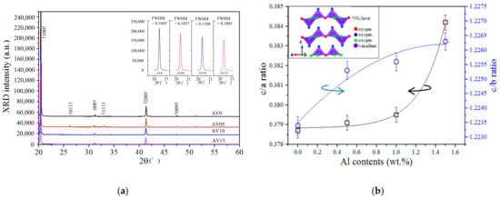 | Al Contents (wt.%) | Diffraction Angle (2θ) | Lattice Constants of V2O5 (Å) | c/a | c/b | ||||