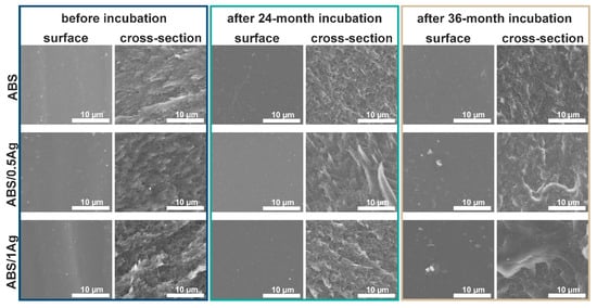 SEM images of the surface and cross-section of acrylonitrile butadiene styrene (ABS) and ABS-based composites modified with 0.5 wt.% and 1.0 wt.% silver nanoparticles (AgNPs) before and after the 24- and 36-month incubation periods in deionized water.