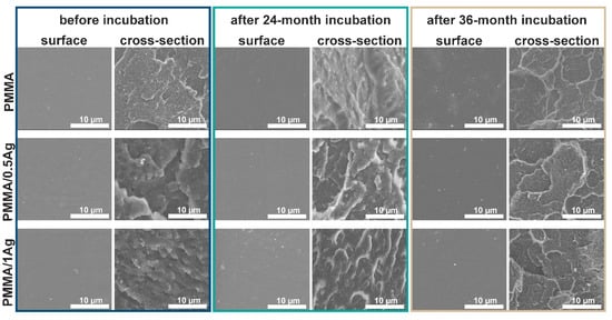 SEM images of surface and cross-section of polymethyl methacrylate acrylic (PMMA) and PMMA-based composites modified with 0.5 wt.% and 1.0 wt.% AgNPs before and after the 24- and 36-month incubation periods in deionized water.