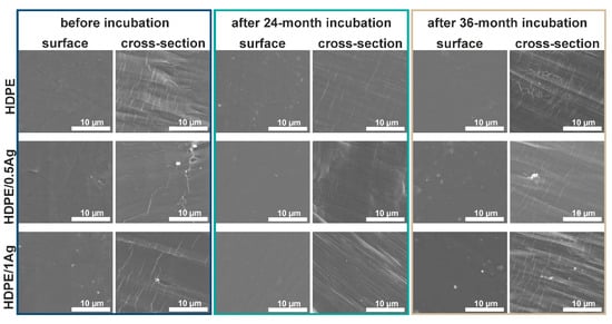 SEM images of surface and cross-section of high-density polyethylene (HDPE) and HDPE-based composites modified with 0.5 wt.% and 1.0 wt.% AgNPs before and after the 24- and 36-month incubation periods in deionized water.