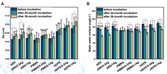 Arithmetical mean roughness (Ra) (A) and static water contact angle (B) of polymers and composites modified with 0.5 wt.% and 1.0 wt.% AgNPs. Statistically significant differences (p < 0.05) between different materials before as well as after the 24- and 36-month incubation periods are indicated by subsequent lowercase and uppercase Latin letters and Greek letters, respectively. Different letters indicate statistically significant differences. Statistically significant differences (p < 0.05) between materials before and after the 24- and 36-month incubation periods are indicated by asterisks (*).