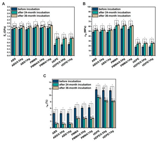 Young’s modulus (A), tensile strength (B) and elongation at maximum force (C) of polymers and composites modified with 0.5 wt.% and 1.0 wt.% AgNPs. Statistically significant differences (p < 0.05) between different materials before and after the 24- and 36-month incubation periods are indicated by subsequent lowercase and uppercase Latin letters and Greek letters, respectively. Different letters indicate statistically significant differences. Statistically significant differences (p < 0.05) between materials before and after the 24- and 36-month incubation periods are indicated by asterisks (*).