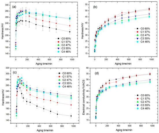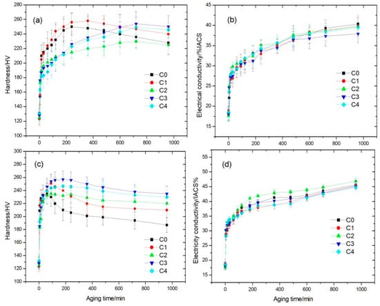 Hardness and electrical conductivity curve of cold rolled Cu-Ni-Co-Si-P-Mg alloys as a function of aging time at different aging temperature. (a) hardness, aging at 450 °C, (b) electrical conductivity, aging at 450 °C, (c) hardness, aging at 500 °C, (d) electrical conductivity, aging at 500 °C.