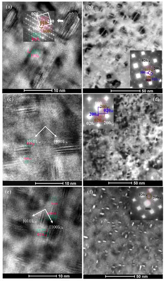 The high strength and electrical conductivity of precipitation hardening Cu-Ni-Si system alloys are mainly controlled by the chemical composition, morphology, size and distribution of nano-sized precipitates. We took the as-quenched C0, C1 and C4 alloys as examples to illustrate the effect of Co addition on the feature of the precipitates during aging at 500 °C. After aging at 500 °C for 0.5 h, TEM micrographs of C0, C1 and C4 alloys and corresponding selected area electron diffraction (SAED) patterns are presented in Figure 3. Figure 3a,b show the precipitates with an average size of 9–10 nm in diameter and 3–4 nm in thickness uniformly distributed in the matrix. Figure 3a illustrates a high resolution transmission electron microscopy (HREM) image of precipitates in the C0 alloy aged for 0.5 h and the corresponding fast Fourier transform (FFT) pattern in the inset. The indexing result of the pattern confirms that these precipitates are mainly orthorhombic δ-Ni2Si phase (a = 0.708 nm, b = 0.502 nm, c = 0.371 nm) [3,6,23]. Figure 3b show a bright field (BF) TEM image of two mutually perpendicular disc-like δ-Ni2Si variants lying on the {110}Cu planes align in the two <110> Cu directions and the corresponding [001]Cu selected area electron diffraction (SAED) pattern in the inset. It can be deduced from Figure 3b that there exist six δ-Ni2Si variants in this alloy. The crystallographic orientation relationships (ORs) between the Cu matrix and precipitates can be concluded from the above diffraction analysis: (001)Cu //(001)δ, [110]Cu //[010] δ. In addition, it can be found that there exists obvious dark strain contrast around two disc sides of these δ-Ni2Si precipitates. It suggests that these nano-sized δ-Ni2Si precipitates are fully coherent with Cu matrix. Figure 3c,d reveal that the size of precipitates decrease to about 7–8 nm in diameter and 3–4 nm in thickness for the C1 alloy, compared with that observed in the C0 alloy. The SAED patterns of precipitates in the C1 alloy are the same as those in the C0 alloy. Figure 3e,f show that the average size of precipitates in the C4 alloy is the smallest among the three alloys, which diameter and thickness are 5–6 and 2–3 nm, respectively. It indicates that the addition of Co can reduce the size of precipitates. The larger the amount of Co in the alloys is, the smaller the precipitates formed is.