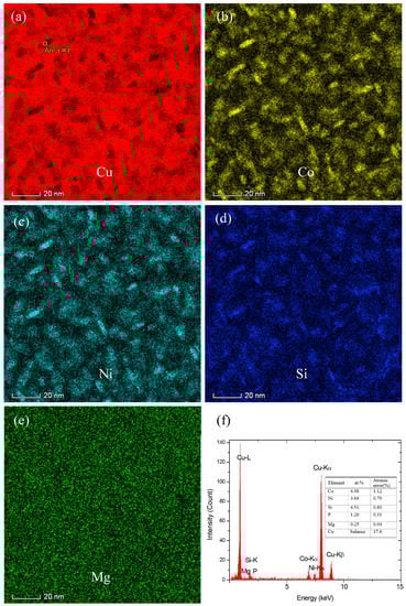 After further aging at 500 °C for 4 h, the precipitates in the Co-free C0 alloy obviously coarsened (Figure 4a), which average diameter and thickness increase to about 17–18 and 4–5 nm, respectively. Figure 4a also reveals clearly the other disc-like δ-Ni2Si variants in the C0 alloy. However, the average diameter and thickness of the precipitates in the C1 alloy are about 13 and 4 nm as shown in Figure 4b–d. For the C4 alloy, the STEM HAADF images in Figure 5 show that these precipitates are about 11 nm in diameter and 4 nm in thickness. The elemental mapping images (Figure 5a–e) demonstrate that these precipitates are associated with Cu, Co, Ni and Si. The elemental mapping microanalyses of X –ray energy dispersive spectrum (EDS) reveal clearly the poorness of Cu and richness of Ni, Co and Si in the disc-like particles. However, Mg seem to exist in the matrix in the form of the solid solution atom. Figure 5f gives the chemical composition of the particle (labeled by “Area #1” in Figure 5a) as follows (at.%): 4.98 Co, 3.64 Ni, 4.51 Si, 1.26 P and 0.25 Mg. Its atomic ratio of (Co + Ni)/Si in this particle is about 1.9 and is close to stoichiometry Ni/Si ratio of 2 in δ-Ni2Si precipitates. Therefore, the precipitates in the Co-containing C1 and C4 alloys are (Ni, Co)2Si phase.