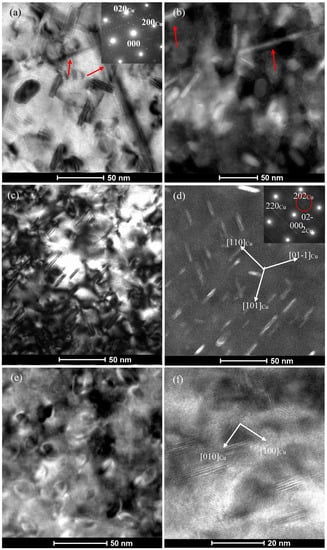 For the precipitation-hardened alloys, precipitation-hardening is one of the most important and effective strengthening methods. It is well known that precipitation-hardening requires an optimal combination of precipitate size and number density to yield the maximum combination of properties, such as yield strength, hardness, and electrical conductivity for copper alloy. In order to obtain a deep insight into the correlation among the composition, microstructure and property in Cu-Ni-Si system copper alloys, it is necessary to understand the strengthening mechanisms of the nanoscale precipitates. According to the interaction mechanism between the precipitates and the gliding dislocations, there are two strengthening mechanisms, namely dislocation shearing and Orowan dislocation bypassing mechanisms [27,28]. When the dislocations cut through precipitates, the strengthening effect Δσcoherency of precipitates is roughly proportional to the square root of total volume fraction f and mean size d of precipitates, which can be calculated by the Equation (1) [29]: