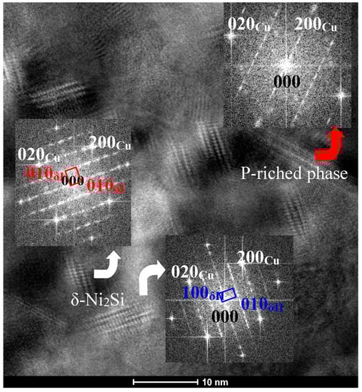 - Jia, Y.L.; Wang, M.P.; Chen, C.; Dong, Q.Y.; Wang, S.; Li, Z. Orientation and diffraction patterns of δ-Ni2Si precipitates in Cu-Ni-Si alloy. J. Alloy Compd. 2013, 557, 147–153. [Google Scholar] [CrossRef]