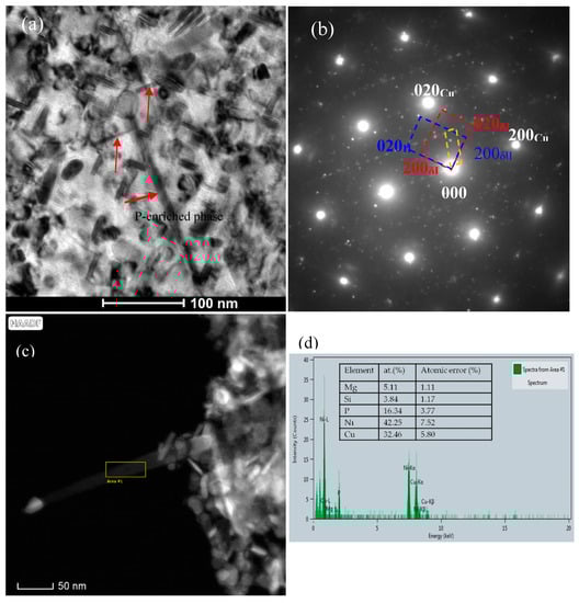 TEM and STEM images of C0 alloy aged at 500 °C for 16 h (a) [001]Cu BF image, (b) corresponding [001]Cu SAED pattern of (a), two sets of pattern (marked by red and blue dash line) belong to the two δ-Ni2Si variants, one (marked by yellow dash-line) belongs to the P-enriched phase. (c) HAADF image of needle-like P-enriched phase and δ-Ni2Si variants, (d) EDS analysis result of P-enriched phase (labeled by “Area #1” in (c). Red arrow in (a) refer to the P-rich phase.