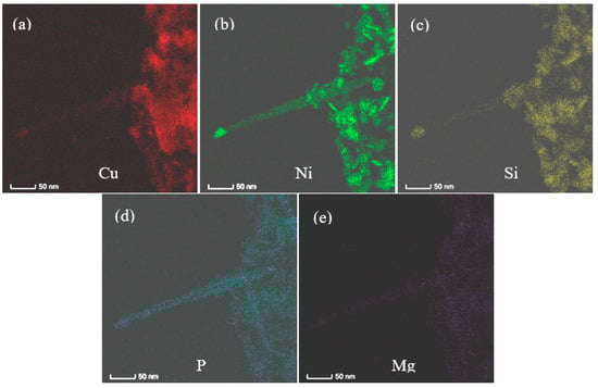 EDS element mapping images of plate-like precipitates of Figure 8 in C0 alloy aged at 500 °C for 16 h. (a) Cu, (b) Ni, (c) Si, (d) P, (e) Mg.