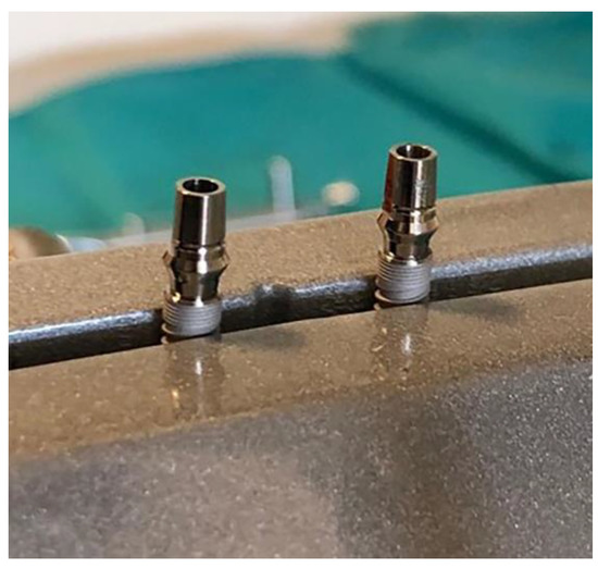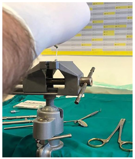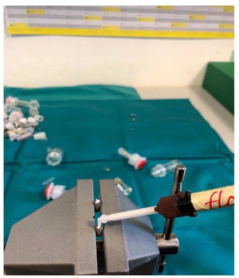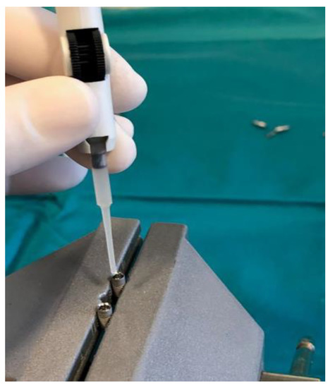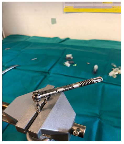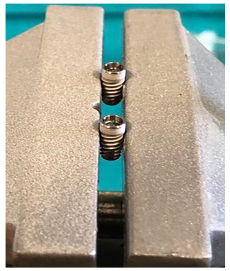 Dental implants and corresponding original prosthetic abutments were removed from commercial packaging under sterile conditions. After being removed from the sterile package, the dental implants were placed in a vertical position in a sterile clamp using sterile forceps. They were then fixed in a sterile stainless steel clamp (Figure 1) to allow firm swivel action when tightening the prosthetic abutment at 20 N/cm (as recommended by the manufacturer) and to keep the implants in a vertical position (Figure 2).