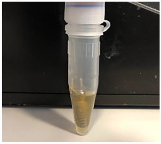 After 14 days of incubation, the samples were removed from the tubes using sterile forceps, then immersed in 70% alcohol for up to 3 min to prevent external contamination. Samples were then dried with sterile gauze before being carefully disassembled in an upright position, in a sterile clamp. After disassembling the samples, the inner surfaces of the implants were sampled using 3 sterile paper sticks/points (Absorbent points, DENTSPLY Maillefer, Tulsa, OK, USA) (Figure 8), which were then immersed in Eppendorf tubes containing 0.5 mL of sterile phosphate buffered saline (PBS). The contents of the tube, along with the paper sticks, were vortexed for 60 s (Corning® LSE™ vortex mixer, Corning, NY, USA) to remove bacterial and fungal cells (Figure 9).