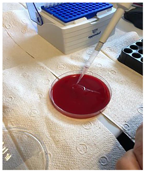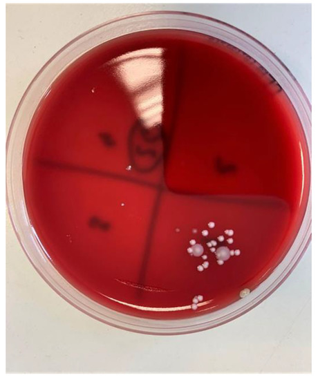 Samples of the complete tube contents were applied to nutrient microbial media with 5% blood agar, then incubated for 48 h at 37 °C (Figure 10). After that, the resulting colonies were identified and quantified (Figure 11). Macroscopically distinctive colonies were confirmed with MALDI Biotyper (Bruker Daltonics, Hamburg, Germany) and the obtained results were entered into the prepared tables.