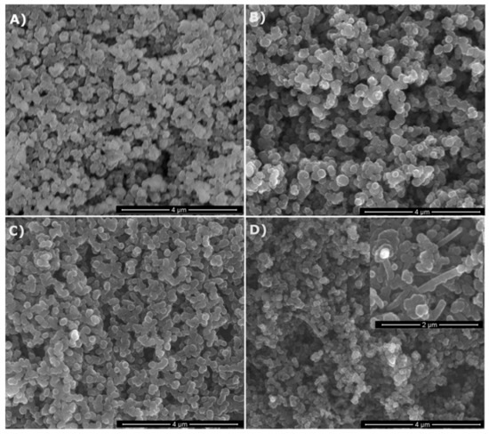 SEM images of selected powders prepared from methyltrimethoxysilane (MTMS): (A)—1200 °C/NH3, (B)—1200 °C/N2, (C)—1600 °C/NH3, (D)—1600 °C/N2 (note higher magnification of the inset).