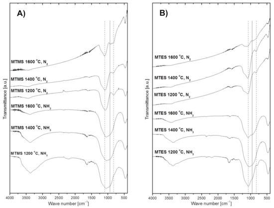 The FT-IR spectra of powders prepared from MTMS and MTES are shown in Figure 4A,B, respectively. In general, all spectra display non-specific broad features due to post-reaction adsorbed water and, likely, ammonia in the suitable cases. The water-specific bands are seen at ca. 3430 cm−1 (H–O–H asymmetric and symmetric stretch contributing to the broad band in this region) and 1640 cm−1 (H–O–H bending mode) [28,29]. The water originates either from adsorption of H2O vapor being a nitridation by-product in ammonia (e.g., from a simplified reaction of Si–O + NH3 → Si–N + H2O + ½ H2), which takes place on powders collected on the filter, and/or it is adventitiously adsorbed from the air during KBr pellet preparation (used here for powders made in both gas atmospheres). In this regard, it is worth noting that the relatively more intense water-related bands in powders made in ammonia, which support the abundance of water in these cases. Additionally, there are also spectral features consistent with some adsorbed ammonia in powders made in an Ar/NH3 atmosphere, namely, the evolving small intensity peak at ca. 3370–3380 cm−1 (N–H degenerate stretches) superimposed on the water band and the corresponding very small intensity band at ca.1560–1580 cm−1 (N–H deformation mode), the latter being clearly separated from the relevant bending mode of water at 1640 cm−1. These ammonia-related bands can be convincingly discerned for both 1200 °C-derived powders, whereas the low intensity bending mode is apparently below the detection limit for the 1400 °C and 1600 °C-prepared products. Finally, a weak shoulder at ca. 3650–3700 cm−1 on the broad water band is consistent with a share of surface hydrogen-bound silanol Si–OH groups formed, for instance, via hydrolysis of the primary surface Si–NH2 groups from nitridation (e.g., Si–NH2 + H2O → Si–OH + NH3). All the discussed non-specific features and the species behind them are consistent with the actual chemical and physical circumstances in the systems, however, from quantitative point of view they are considered of secondary significance in this study. With this in mind, the remaining major bands are for us sample-specific and yield important information about the species present in the powders. In all cases, there are only a few bands that show up in the chemically feasible bond mode ranges. Notably, there are no bands in the range 2900–2980 cm−1 characteristic of C–H stretching vibrations in hydrocarbon groups, which supports the efficient decomposition-assisted reaction chemistry of both organosilicon precursors towards inorganic solid products. For Si–O species, the stretching and bending vibrations are expected and seen in the 1060–1080 cm−1 range and at 470 cm−1, respectively [24,30], whereas potential Si–N stretching and bending modes may be overlapped between 950 and 1000 cm−1. In addition to these bonding modes, Si–C stretching vibrations are expected between 800–900 cm−1 [31,32,33,34,35] to further complicate the deconvolution of the broad band seen in the 800–1100 cm−1 range. The vertical lines in Figure 4 illustrate the overlap of the discussed peaks and the qualitative nature of their assignments given the broadness/irregularity of the resulting bands. This kind of data can only be used as supporting evidence for the presence of specific Si–X bond containing species (X = C, N, O), but when supplemented by direct O- and N-content determinations they constitute easily available and relevant information.