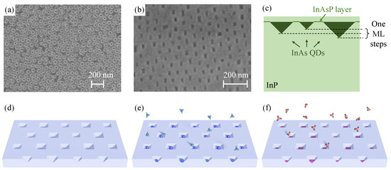 (a,b) SEM images of (a) hard silicon oxycarbide mask formed after oxygen plasma treatment in ICP-RIE, (b) the InP surface after CBr etching in the MOVPE reactor and the subsequent oxycarbide mask removal. (c) The scheme of the InAs QDs ensemble embedded in the InP substrate. (d–f) A simplified scheme of the QDs deposition process: (d) nanopits in InP, (e) indium deposition and formation of indium droplets in nanopits, (f) re-crystalization of QDs under the arsine atmosphere.