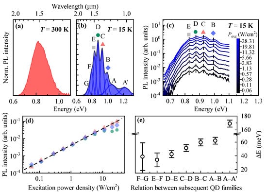 The above-stated assumption on recombination processes, justified by the excitation power-dependent PL experiment, is essential for the analysis of individual PL peak energy positions. Since each of the individual PL bands is contributed by emission from the size-distributed QDs, and the QD ground state emission energy (E) is governed mainly by the dot height (H), the energy difference between subsequent PL bands should scale in a non-linear way according to . Figure 2e shows that this scenario can be realized for the studied QDs. The energy distance between subsequent PL bands monotonically decreases in the range of 40–60 meV with decreasing the PL peak energy, and so the dot height in the individual PL modes A to G as well. The observation of multimodal emission in site-selective DE QDs is consistent with that for SK InAs/InP QDs [1,37,38,39,40,41,42,43,44] and SK InAs/GaAs QDs [45]. However, the reason for the formation of multimodal QDs presented in this work can be different due to the involved fabrication procedure.