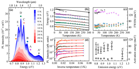 (a) Temperature-driven evolution of the PL spectrum from multimodal site-selective DE InAs/InP QDs. Capital letters and symbols (if applied) label subsequent PL modes. (b) Temperature dependence of the PL peaks energy. Solid black lines show temperature-driven bandgap changes for InAs according to the Varshni formula (Equation (1), curves are shifted in energy). (c) The FWHM (peak width) vs. temperature [symbols as in (a)]. (d) Temperature-driven PL intensity quench [symbols as in (a)]. Solid red lines are fitted to the data accordingly to Equation (2). (e) The extracted PL intensity quench energies (squares) and (circles) from (d) as a function of the PL mode emission energy.