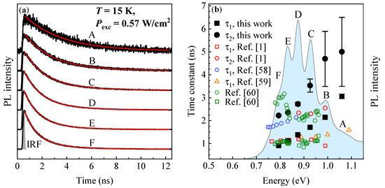 Low-temperature TRPL traces registered for PL modes A to F of the investigated QDs are presented in Figure 4a (solid black lines). Each TRPL trace is best fitted with a double-exponential decay function, displayed as a red solid line in Figure 4a, to extract decay time constants: and . We use the function of the form: