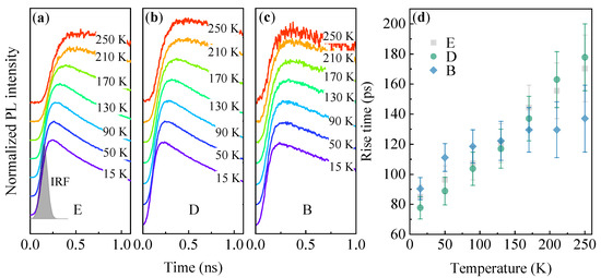 Examples of TRPL traces with highlighted temperature evolution of the PL intensity rise for the PL modes E (a), D (b), and B (c) for site-selective DE InAs/InP QDs. (d) The extracted PL rise time as a function of temperature.