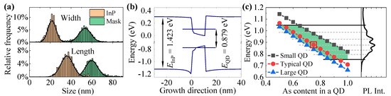 Therefore, the QD band structure calculations are performed in the space of two parameters: QD geometry and chemical composition. Figure 6b shows the band structure for the “typical” QD, plotted along its growth direction, together with calculated fundamental electron and hole energy levels. The ground state energy of the dot is defined as the difference between these states. The geometry of the QD is , , , and the As content in the QD is C, marked also with the red square in Figure 6c. Note that the energy differences between the QD electron fundamental level and the conduction band edge in InP (), and between the hole fundamental level and the valence band edge in InP () are much higher than the observed PL intensity quench energies. This further supports our interpretation of the temperature-dependent PL.