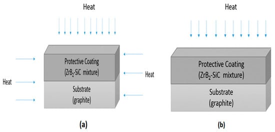 A SiC-reinforced ZrB2-based UHTC was built by Zhang et al. [25]. The defensive capabilities of these models have been demonstrated with a heat-pressing procedure at high temperatures (>2300 °C). The stability and oxidation strength of UHTCs depend mostly on simulated re-entry conditions in the atmosphere [25,26]. However, at higher temperatures (above 2300 °C), the oxidation and removal of the material do not demonstrate ample resistance to the aerothermal heat load that is being applied. In addition to oxidation during functional operations, mechanical loads should be considered. ZrO2 can provide the configurable stability of the substance, here with the oxide frame not having to be removed by the flow of the gas. The temperature limits of UHTC are subject to the relaxation and degradation of the ZrO2-based oxide scale, which is also regulated by SiC material because nearly all SiO2 material is compared with the melting point of the ZrO2-based oxide scale, where SiC content is controlled. When the shear forces go beyond the strength of the shaped oxide structure during the ablation process, the oxides peel off from the specimen, causing increased oxidation and configuration degradation and impacting the vehicles’ performance and protection.
