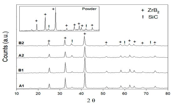 The starting powder and coating samples were all performed with XRD. The XRD patterns are shown in Figure 4. The XRD patterns can be entirely indexed to ZrB2 and SiC, that is, only the initial phases are included in the coating. Additional phases were not observed, such as for SiO2, ZrO2, B2O3, or ZrSiO4. The absence of oxide stages in the coating is because of the parameters of spraying used (in inert atmosphere deposition, H2 as plasma gas). However, the XRD patterns suggest that the preservation of ZrB2 and SiC phases in the deposited coatings and the chemical elements analysis features a quantity of silicon in good agreement with the starting powders as shown in Table 3. Earlier works [18,19,20,21,22,23] showed that if the SiC content is lower than the ZrB2 content, ZrB2-SiC coatings could be produced. SiC decomposition, as seen in the pseudo-binary phase diagram for ZrB2-SiC (Figure 1), does not occur during spraying because of the fluid phase formation at a temperature below SiC decomposition, when there is a 2207 °C eutectic process [24]. The signatures of second and third SiC peaks in the ZrB2-SiC B1 mixture (70%-30%) are not detected using XRD between 2θ = 60° to 80° and the phase composition periodicity can only be detected at lower angles.