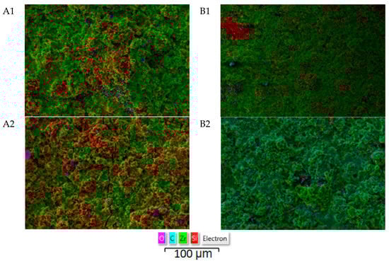 This coating composition is expected to proceed with the above-mentioned liquid phase formation process below the SiC decomposition temperature. Figure 5 and Figure 6 show the surface of the A1, B1, A2, and B2 SiC-ZrB2 coating observed by SEM for low magnifications: it appears to be compact and uniform (Figure 5), and no unmelted particles were observed (details of ZrB2-SiC mixture particles and EDS analysis images shown in the Supplementary Materials Figures S1–S15). The observed variance of gray colors indicates the presence of various Zr and Si compounds. EDS analyses verified that the SiC particles are composed of dark gray regions, ZrB2 particles are made of white zones, and Zr- and Si-containing gray-intensity middle zones are present. The theory of a fluid phase formation based on the phase diagram seems to be supported by metallographic research. The coating tends to be shaped in high sizes by splats of various morphologies at high magnifications (Figure 6). This can be clarified if the substrate is affected by certain particles in a part-molten state, that is, within the solidus–liquid range at a temperature; other particles have melted entirely, that is, above the temperature of the liquid. These two circumstances correspond to points A and B of Figure 1, respectively. This can be attributed to: (a) different sizes of the particles, (b) different compositions (flowing around the nominal), and (c) different thermal backgrounds during spraying.