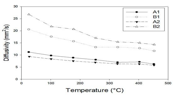 Diffusivity as a function of temperature for A1, B1, A2, and B2.