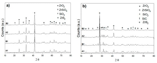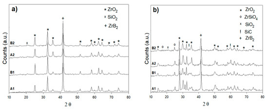 A gas torch test was given for relative exposure times (5 min) and a furnace treatment test for 30 min after long-term oxidation up to 1200 °C in preparation for UHTC compositions of SiC-ZrB2. The torch test was conducted for XRD patterns A1, B2, A2, and B2, which are comparable with those XRD patterns of the composites tested in the furnace at 800 °C (Figure 9a,b). The XRD patterns of both composition measures is shown in Figure 9a. Here, 70% SiC–30% ZrB2 and 50% SiC–50% ZrB2 are very different from those in Figure 9b: the ZrB2 peaks also were present after oxidation, but silica was the only extra surface step. Oxygen, silicone, and boron were primarily the exterior glass layer of the furnace treatment; in addition, some traces of zirconium existed. A sample with a 30% SiC–70% ZrB2 had a content of Si; thus, O was higher than in the 50% SiC deposited coatings and displayed a more Si-rich glass-like phase with a rising SiC level. The appearance of a diffraction peak corresponding to ZrO2 superimposes a broad signal that was characteristic of the presence of an amorphous phase such as a glassy one. The XRD spectra obtained from the oxide scales formed during isothermal exposure at 1000 °C and 1200 °C (torch compared to the furnace test) are shown in Figure 10a,b and Figure 11a,b respectively. The results showed that the principal phase in an oxide scale was monoclinic ZrO2, while tetragonal zirconia was not found in the torch setting for the samples oxidized at 800 °C. Tetragonal zirconia may be able to form during oxidation but can also be transformed during cooling into monoclinic zirconia [14,27]. In the sample oxidized at 1000 °C and 1200 °C, some traces of zircon (ZrSiO4) were detected. While the formation of stable zircon may be predicated based on a ZrO2-B2O3-SiO2 system ternary isothermal segment at 1000 °C, this compound is frequently not recorded in high-temperature oxidized ZrB2-SiC composites (>1500 °C) [27,28]. It is worth noting that in the B1 XRD pattern at 1200 °C, a bump due to the amorphous SiO2 can be observed while in the XRD pattern at 1000 °C crystalline SiO2 (cristobalite) exists; this is the outcome from a continuous devitrification of the amorphous silica film [18].