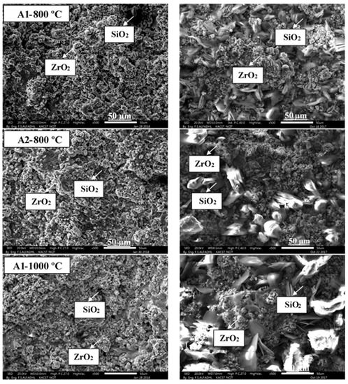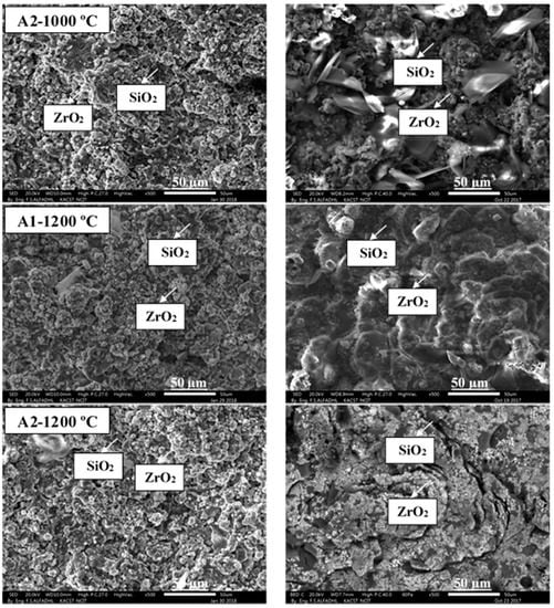 SEM analyses were conducted on sample surface at 800 °C and 1000 °C for A1 and A2, as defined in Figure 12. The findings of the SEM observation are consistent with the suggested oxidation mechanism [29]. The polygonal grains of B2O3 could be observed on a sample surface exposed to a furnace at 800 °C and 1000 °C; the grains correspond to the formation in the initial stage of the first B2O3 nucleuses. Conversely, B2O3 is already formed in the sample exposed at 1200 °C and partly covers the sample surface. The samples can contain unoxidized SiC particles. The A2 sample reveals an oxidized film of pore-like zirconium oxide and silicone oxide islands exposed to a temperature of 1200 °C. Samples exposed to higher temperatures have been documented as being to compact silicon oxide scale, including ZrO2 [19]. A comparison of the SEM-surface micrographs of torch-oxidized specimens reveals that the oxide level produced was rougher and grainier than that produced in the furnace. With the extensive formation of bubbles, all these oxide levels appear porous. The surface was often protected by a dense silica layer of glass (800 °C, 1000 °C and 1200 °C) with aggregated zirconia in various sizes and types. This aspect of the surface conforms to the ZrB2-SiC bulk composite oxidation mechanisms described in [29]. In fact, a borosilicate oxide (B2O3-SiO2) film forms on the outer surface during high-temperature oxidation of ZrB2-SiC. Here, boria is preferentially evaporated from the fluid borosilicate because of the high vapor pressure of boria at these temperatures relative to silica. The liquid oxide film on the outside then becomes a primarily viscous SiO2-rich fluid that covers and fills the pores of the porous oxide dimension. Gas product coalescence (i.e., CO) within the external-forming glass most likely contributes to the creation of large bubbles. The key difference caused by exposure temperatures is that the oxide scale has risen and that the zirconia particles decreased simultaneously on the surface, with cracks and discontinuities being found.