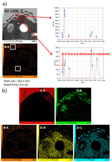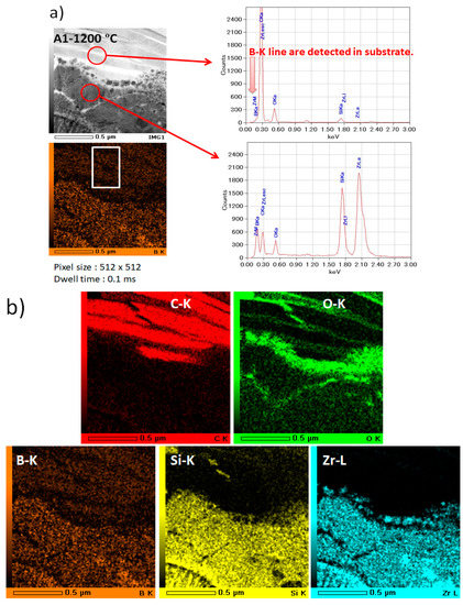 The TEM results are well in line with the XRD data shown in Figure 11b. The bright field (BF) picture reveals that the grain size of A2 is less than A1. SiC particles are also distributed on the substrate’s grain boundaries. Figure 13a and Figure 14a show that Zr, Si, O, B, and C are composed of different positions along the red arrows in the interface region. The analysis of those figures indicates that as indicated by the EDS maps (Figure 13b and Figure 14b), the oxidizing scale consists of a continuous SiO2-rich layer containing different quantities of particulate zirconia. To restrict the internal diffusion of oxygen into the inner bulk and, thus, increase resistance to oxidation, the formation of an external glass layer based on silica was found to be extremely successful. However, oxide layers of boron were found, presumably because of the formation of B2O3. This item should be viewed as ZrB2 particles under oxidized layers when evaporating above 1100 °C [19,20]. The ZrB2 synthesis process also provides possible explanations for the existence of this boron-containing step. Indeed, ZrB2 is commonly produced from boron oxide, zirconium oxide, and carbon at temperatures above 2400 °C in an arc furnace by means of a process boron-carbothermal [30]. The following reaction (Equation (2)) occurs simultaneously: