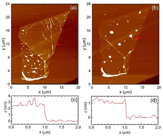 AFM images of the WSe2 flake on the top of the annealed hexagonal boron nitride (hBN) layer: (a) before and (b) after the annealing for 20 min at 180 °C in air. Line profiles of the red lines shown in the AFM images (c) before and (d) after annealing.