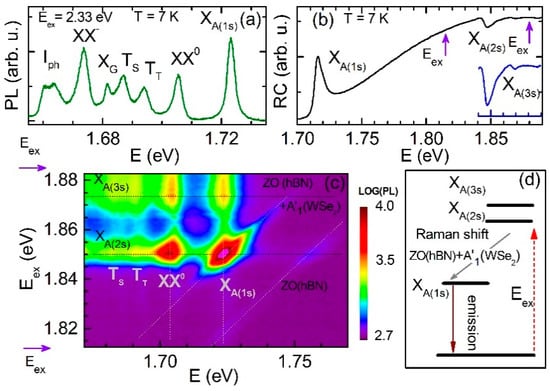 Next, we demonstrate PLE results for tuning the laser excitation energy from Eex = 1.88 eV (above the energy of the A exciton in the 3s state) down to Eex = 1.81 eV. Figure 2c shows a 2D color plot which combines the PLE spectra measured. The horizontal and vertical axes correspond to the emission and excitation energy, respectively. The emission intensity is displayed in the color logarithmic scale. In comparison to the non-resonantly excited PL (see Figure 2a), two additional peaks appear at the high energy side of the emission spectrum. They shift linearly with changes in the laser excitation energy. The peaks were reported in previous studies and were attributed to Raman scattering phonon modes [38,39]. The mode observed at higher energy was attributed to the ZO hBN mode which is silent in Raman scattering spectra of an isolated hBN. However, it gains intensity by more than two orders of magnitude due to the resonant coupling to electronic transitions in the WSe2 monolayer. The mode at lower energy is a superposition of the ZO mode from the hBN layer and the A′1 mode from the WSe2 monolayer. When the combined mode ZO (hBN) + A′1(WSe2) matches energetically with the radiative recombination of the A exciton (XA), its emission and that of the biexciton (XX0) become strongly increased. The enhanced emission of the neutral exciton was also found in a previous study of the similar heterostructure performed at a higher temperature of T = 77 K [38]. It was attributed to a double resonance in which the outgoing photon energy corresponds to the energy of the 1s A exciton in the WSe2 monolayer, whereas the ingoing laser excitation was in resonance with a hybrid state existing only in hBN/WSe2/hBN. However, as one can clearly evaluate from the RC and PLE spectra recorded for our heterostructure (Figure 2b,c, respectively) the outgoing (ingoing) photon is in resonance with the 1s (2s) A exciton. This double resonance process is schematically presented in Figure 2d. Our observation that in the double resonance process two states of the same exciton (1s and 2s) are involved allows for a comprehensive explanation of the considerably enhanced emission intensity. Furthermore, to the best of our knowledge the strong increase in the emission intensity of the neutral biexciton XX0 at the double resonance condition is observed for the first time. It is likely due to the fact that the XX0 state is a combination of the bright (spin-allowed) and long-lived dark (spin-forbidden) excitons residing at the K and K′ valleys, respectively [36,53]. Interestingly, the intensities of all detected PL lines are enhanced when the laser excitation energy is equal to the energy of the 3s A exciton state at 1.875 eV. In this case the intensity enhancement is not as strong as in the double resonance process, since the former process is governed by a single resonance when only the ingoing photon resonantly excites the 2s A exciton.