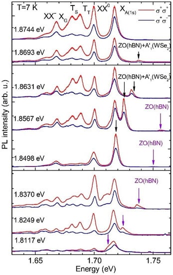 Helicity-resolved PL spectra recorded in two circular polarization configurations of excited and emitted light: The same (co—polarized, σ+/σ+—red line) and opposite (cross-polarized, σ+/σ−—blue line) polarizations. Excitation energies are marked at the left corner of each spectrum. The energy positions of PL lines are marked in the upper panel. The Raman phonon modes ZO (hBN) + A′1(WSe2) and ZO (hBN) are marked by black and violet arrows, respectively.