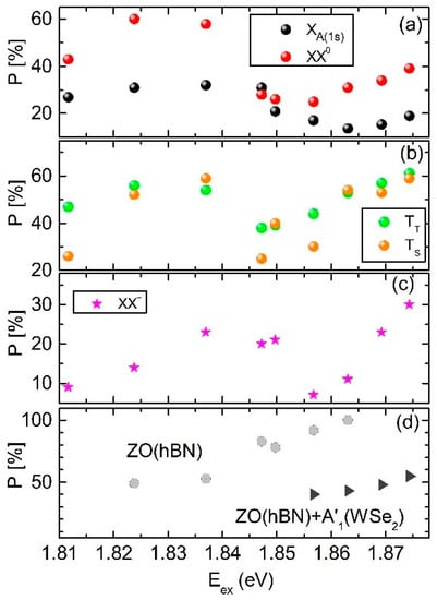 Let us now analyze the excitation energy evolution of the circular polarization degree of the trion lines TT and TS, as presented in Figure 4b. A subsequent decrease and increase in their polarization degrees with reducing excitation energy is observed similar to that of XA and XX0. Additionally, for the trions, an intriguing variation of their relative polarization degree at particular excitation energies is revealed. At all excitation energies the polarization degrees of the triplet and singlet trion emissions are almost the same, except (i) for the laser excitation energies Eex = 1.8567 eV and Eex = 1.8475 eV, when the polarization degree of the triplet trion exceeds about 1.5 times those of the singlet trion, and (ii) for the excitation with energy Eex = 1.8117 eV, when their polarization degree ratio is equal to about two. The clear difference in the polarization degrees of the triplet and singlet trions has been observed in previous reports [15,54,55] concerning WS2 monolayers (with the same ordering of spin-split conduction and valence band as in WSe2 monolayers) and has been attributed to their different dephasing rates. According to ref. [54], due to exchange interaction an electron–hole pair forming the triplet trion at one valley is scattered to the opposite valley and forms the singlet trion; thus, the triplet trion feeds the singlet trion. The efficient scattering of electron–hole pairs between opposite valleys needs a contribution of phonons with appropriate energies and momenta. This scattering process is more efficient at a double resonance when the ingoing and outgoing photons are in resonance with the singlet and triplet trions. This double resonance is achieved at particular excitation energies which manifests itself in a variation of the triplet-singlet polarization degree ratio. These particular phonons can originate from both the WSe2 monolayer and hBN as well as the Si substrate. The comprehensive understanding of the nature of these variations calls for further experimental and theoretical studies.