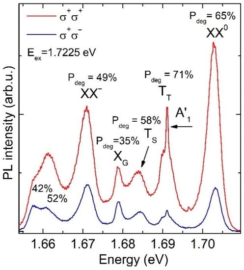 Additionally, we performed polarization-resolved PL measurements with an excitation energy equal to the XA(1s) resonance. The spectra recorded in the co-polarized, σ+/σ+ (red line), or cross-polarized, σ+/σ− (blue line), configuration are plotted in Figure 5. As seen from the comparison of the polarization degrees presented in Figure 3 and Figure 5, a high optical orientation of all lines (it is the circular polarization of the outgoing light with respect to the circular polarization of the excitation light) is also obtained for ingoing photons being in resonance with the 1s A exciton and thus due to interlayer electron–phonon coupling. Consequently, the optical orientation of all PL lines may be controlled by selective excitation.
