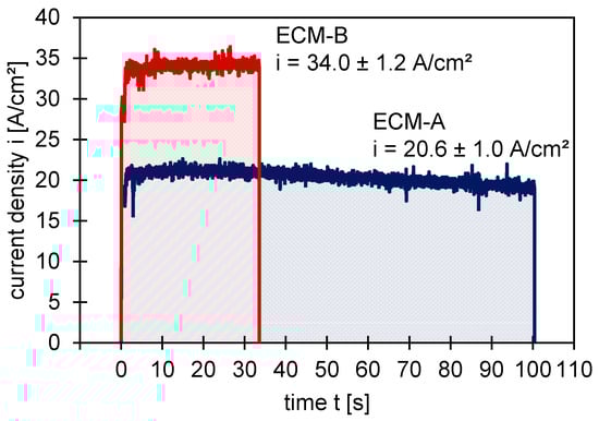 Focusing first on the influence of the current density on the electrochemical material removal, the current densities for both the ECM-A and ECM-B processes were determined. Figure 1 shows the course of the current density during the two ECM processes as a function of time. After a short, approximately three second stabilization phase, the current density is roughly constant for the duration of the remaining machining process. The average current density for the ECM-A process is 20.6 ± 1.0 A/cm2 and for the ECM-B process 34.0 ± 1.2 A/cm2.
